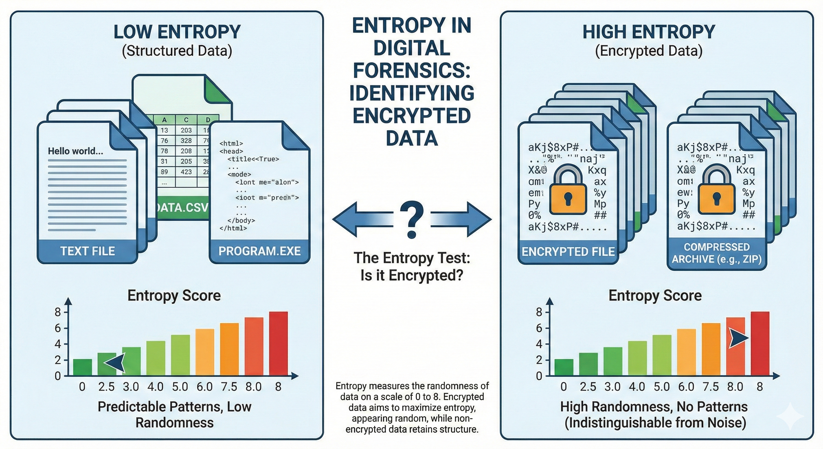 What is Entropy? Before we can detect encrypted files, we must understand the concept of Shannon Entropy. In digital forensics, entropy is simply a measure of randomness.