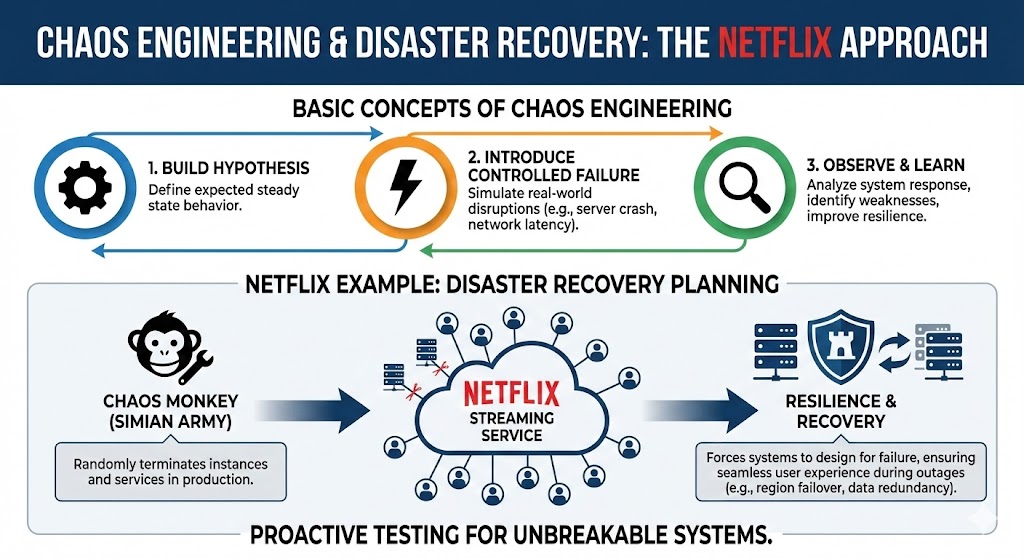 Some organizations take DR testing to the extreme through a practice called Chaos Engineering—the discipline of intentionally injecting failures into production systems to verify resilience. The most famous example is Netflix's "Chaos Monkey," a tool that randomly terminates servers during business hours to ensure their streaming platform can survive unexpected outages. The philosophy is simple: if your system is going to fail, it's better to break it on purpose during work hours when engineers are ready than to discover weaknesses at 3:00 AM on a holiday weekend. While Chaos Engineering is an advanced practice typically found in large tech companies with mature DevOps cultures, understanding its existence helps illustrate an important principle—the most resilient organizations don't just hope their systems can handle failure, they prove it by failing constantly in controlled ways.