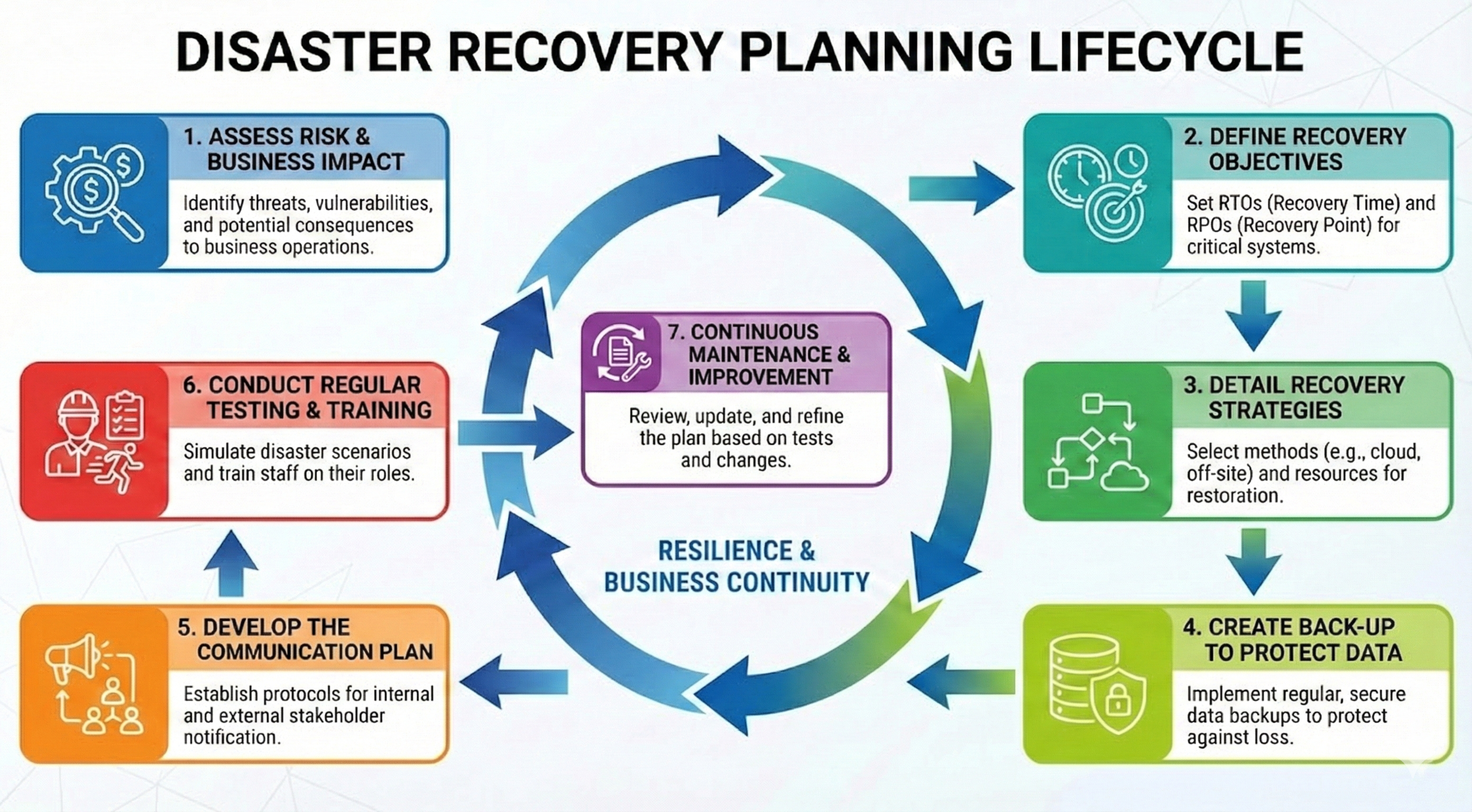 Building a robust Disaster Recovery Plan (DRP) is not a one-time event; it is a cyclical process of identification, strategy, implementation, and validation. We divide this process into seven distinct steps to ensure no critical technical dependency is overlooked.