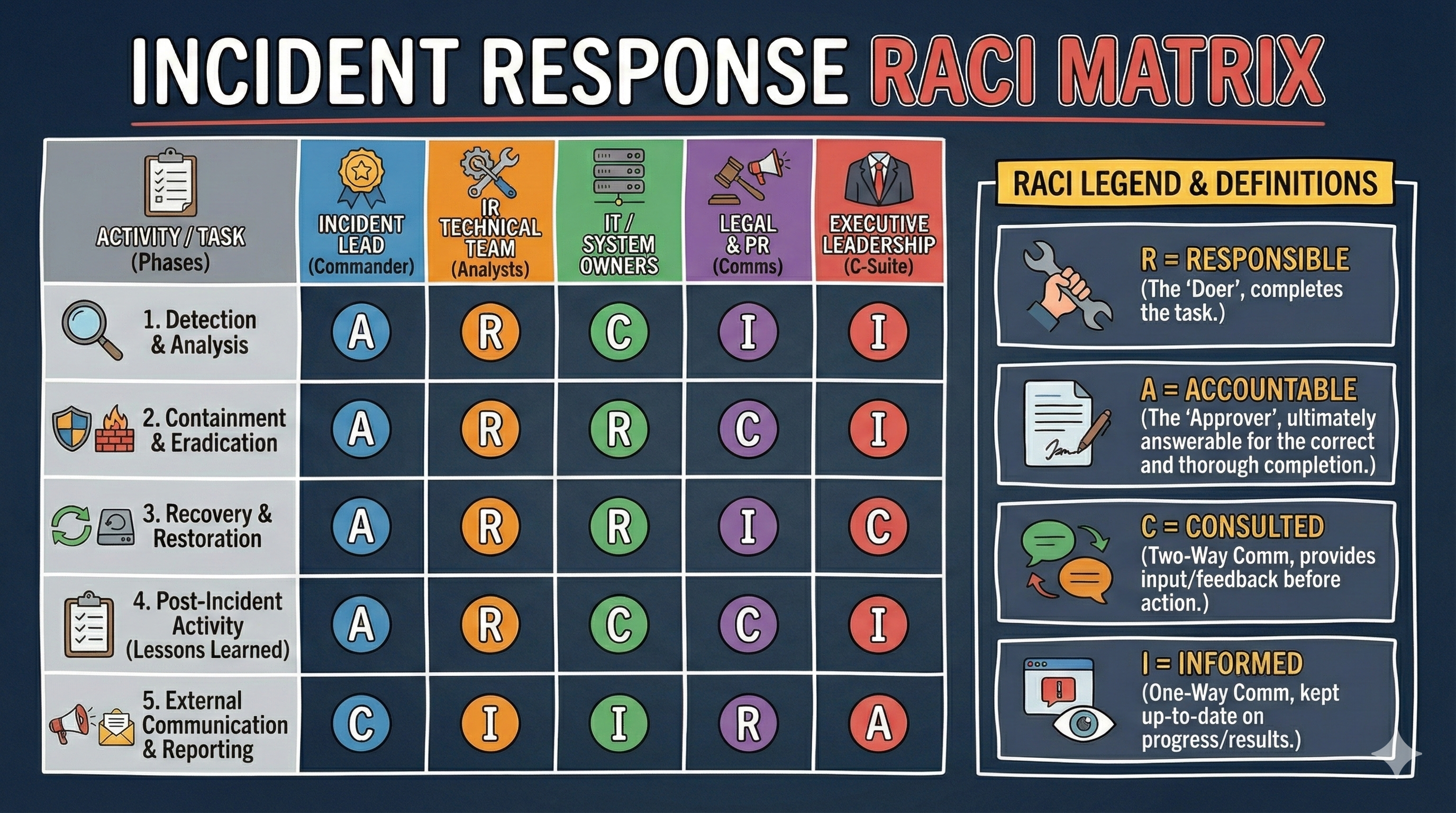 To solve this, IR teams utilize a RACI Matrix—a linear responsibility chart that clarifies ownership for every major task.