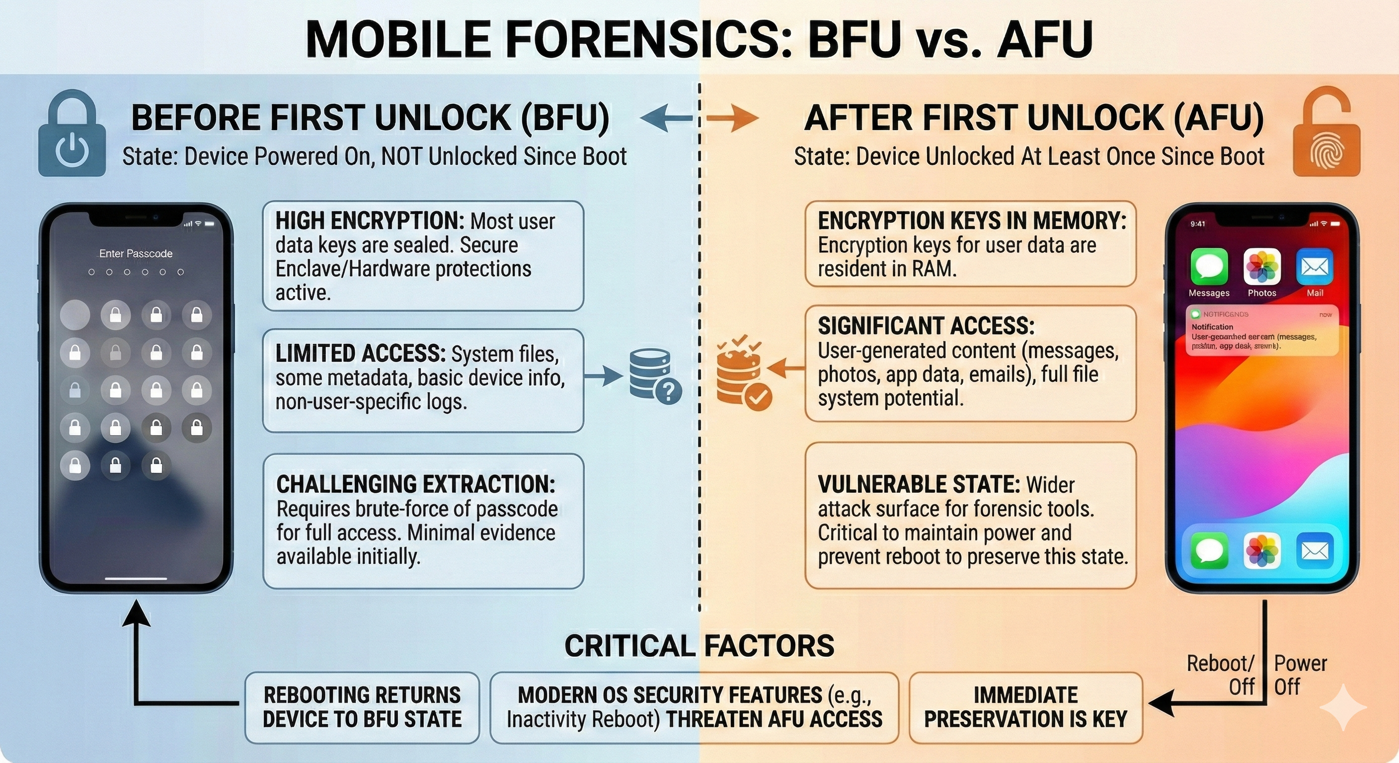 - The Consequence: If a modern iPhone or Android device runs out of battery and shuts down, it reverts to BFU (Before First Unlock) mode upon reboot. In BFU mode, the encryption keys are evicted from RAM. Even if you have the best forensic tools in the world, the amount of data you can extract from a BFU device is significantly less than an AFU device.