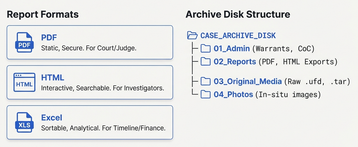 When the investigation is complete, you must deliver your findings to the requestor (detective, attorney, or court). This usually involves a "Final Report" and an "Archive Disk" (or high-capacity USB drive).