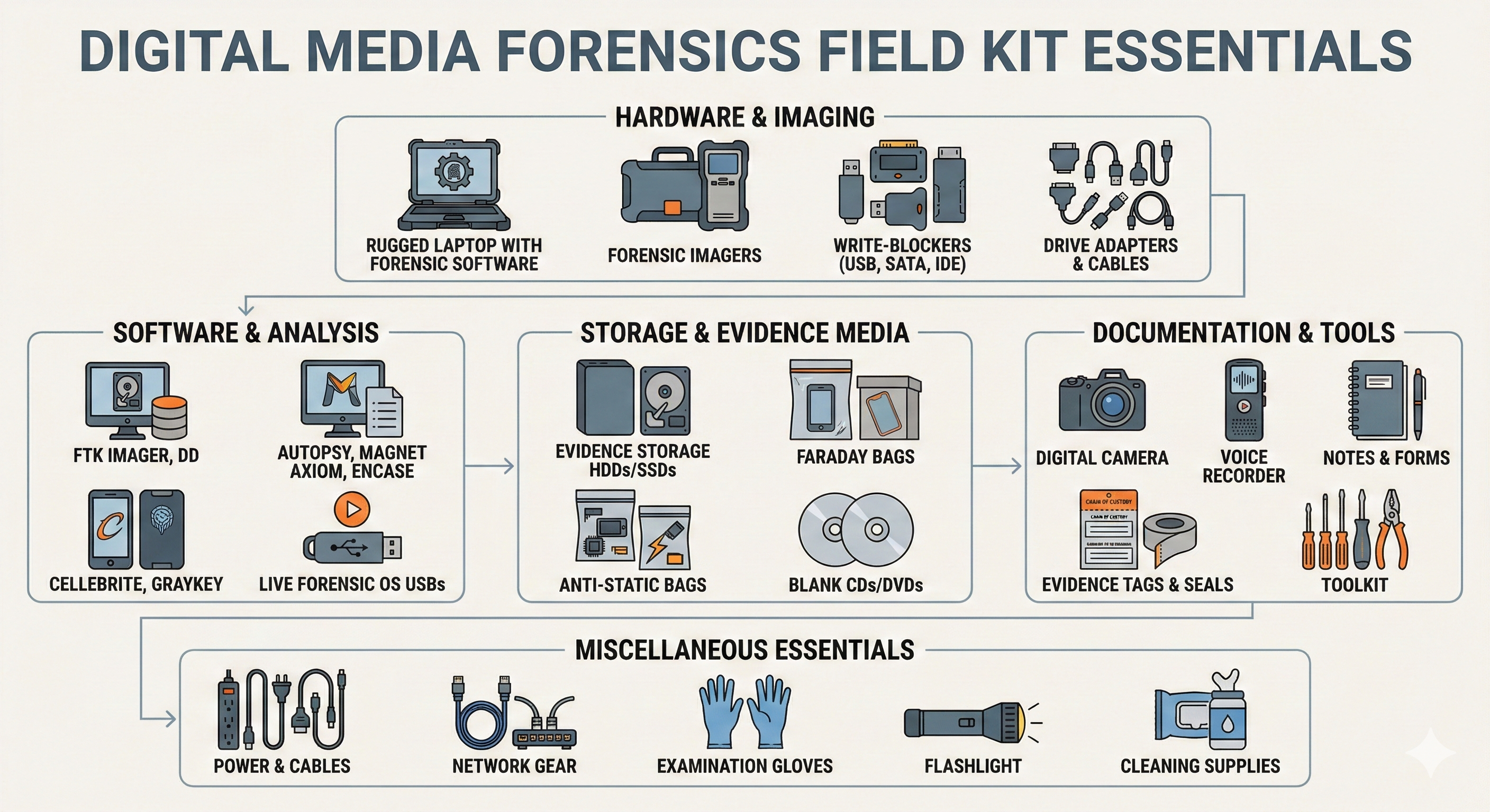 A digital forensic investigator is only as effective as their toolkit. When deploying to a scene, you cannot rely on borrowing equipment. A standardized "Go-Bag" ensures you are ready for isolation, preservation, and documentation.
