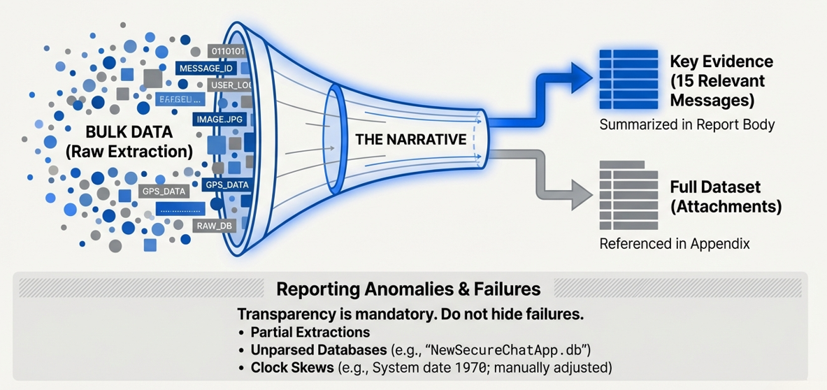 - Summarize, Don't Dump: The written report should highlight the data relevant to the investigation (e.g., "Found 15 chat messages related to the sale of 'product'").
