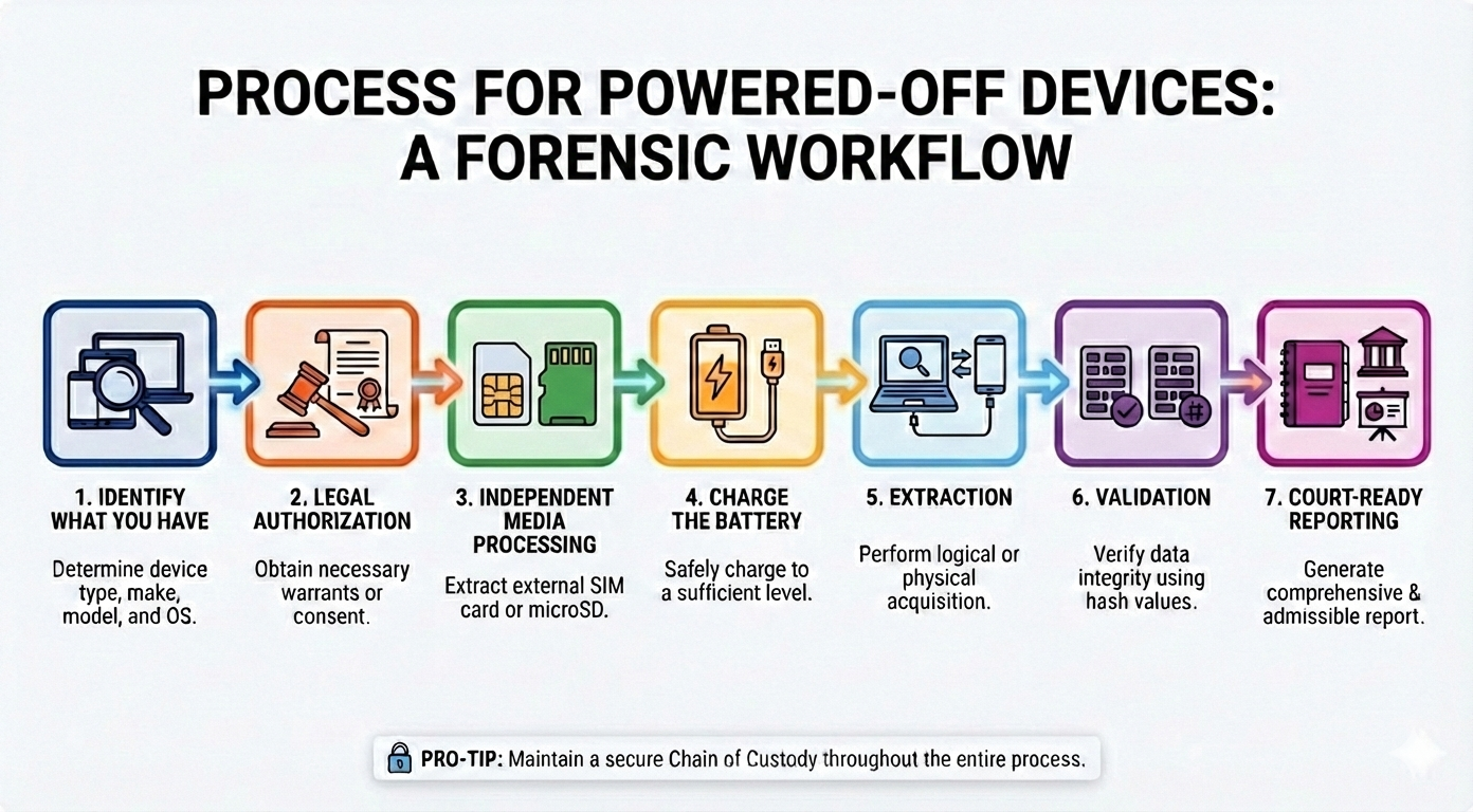 When a device is powered off, it is in its most secure state (BFU - Before First Unlock). The encryption keys are cold, and the operating system is not facilitating data access. Therefore, the workflow changes from "preservation of volatile state" to "methodical preparation for bypass."