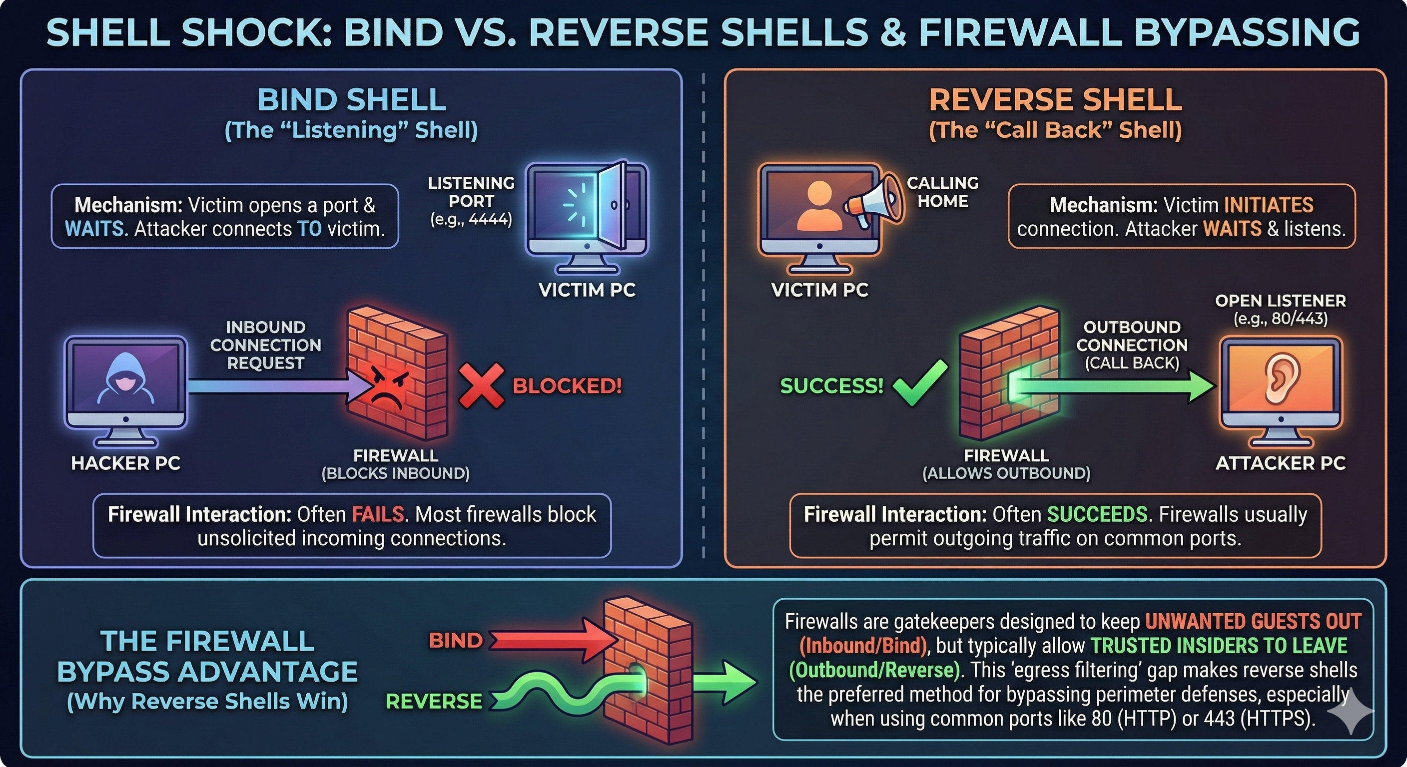 This is the standard for almost all modern malware. In a Reverse Shell, the malware on the victim's computer initiates the connection out to the attacker.