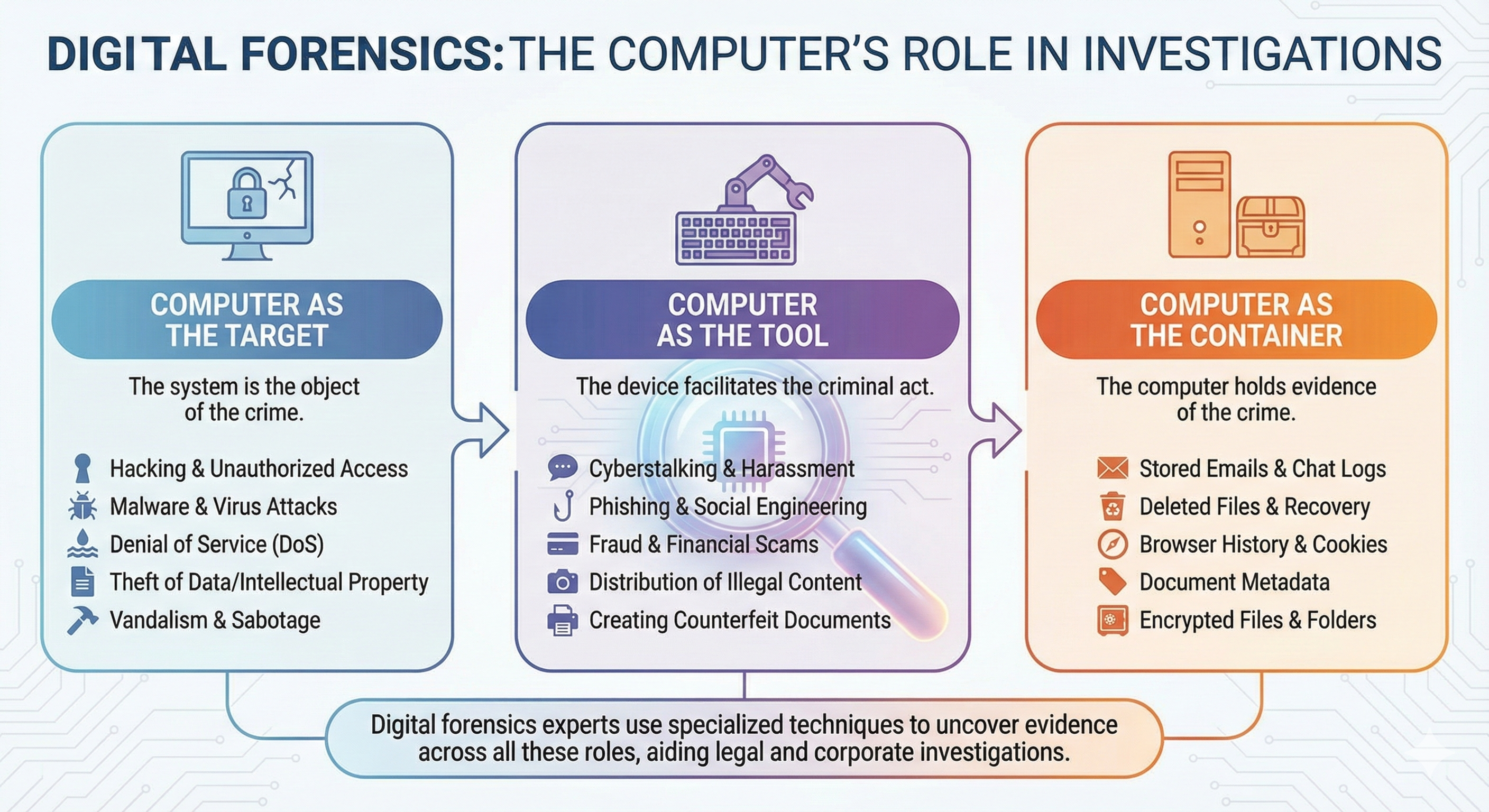 To identify relevant evidence, the investigator must first categorize the nature of the crime. In digital forensics, crimes are typically categorized into three distinct buckets based on the role the computer played in the offense. This categorization dictates the forensic strategy.