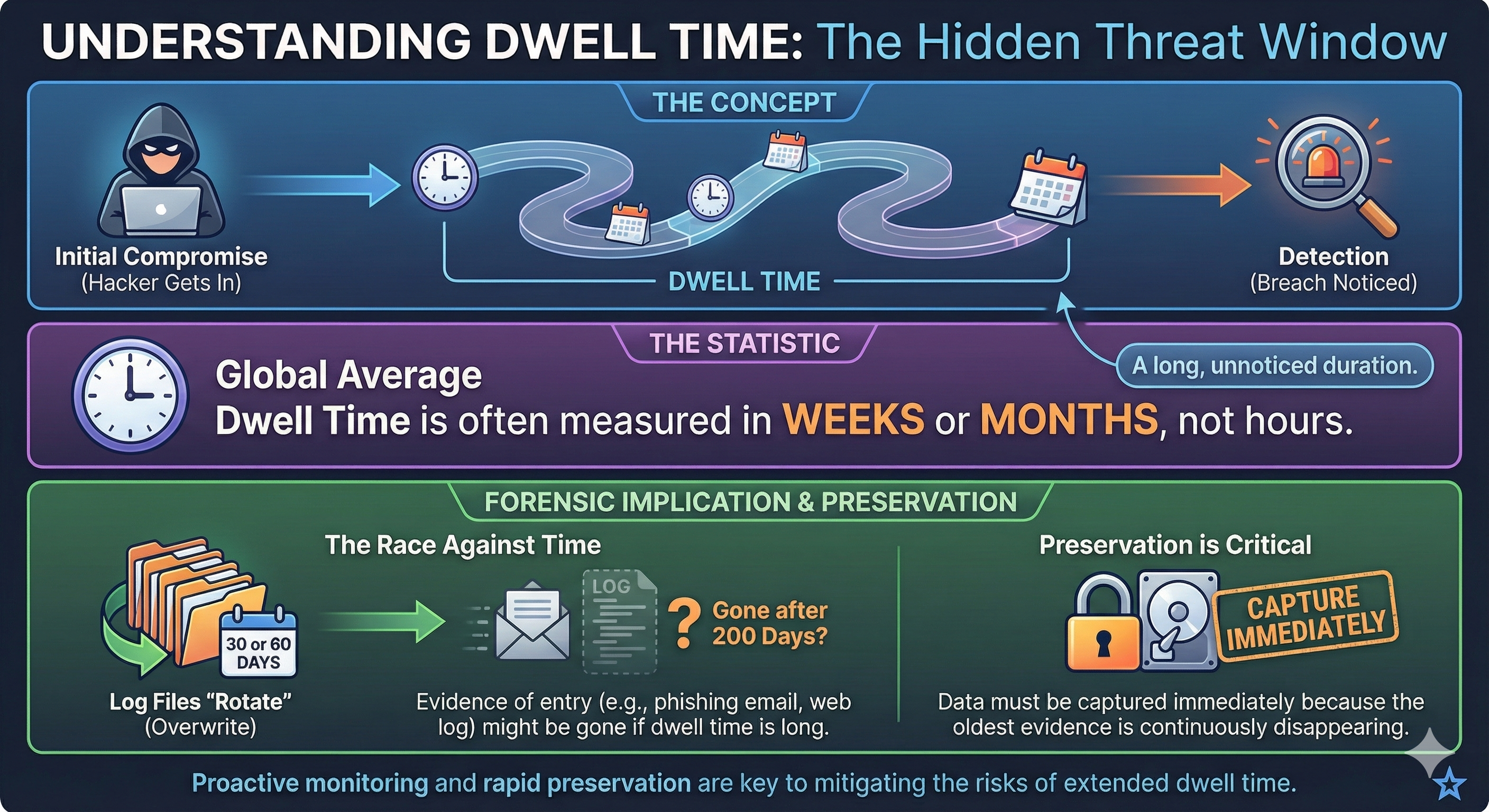 - Forensic Implication: If the dwell time is 200 days, the evidence of entry (the phishing email or web log) might be gone. Log files often "rotate" (overwrite themselves) after 30 or 60 days. This makes Preservation critical—data must be captured immediately because the oldest evidence is continuously disappearing.