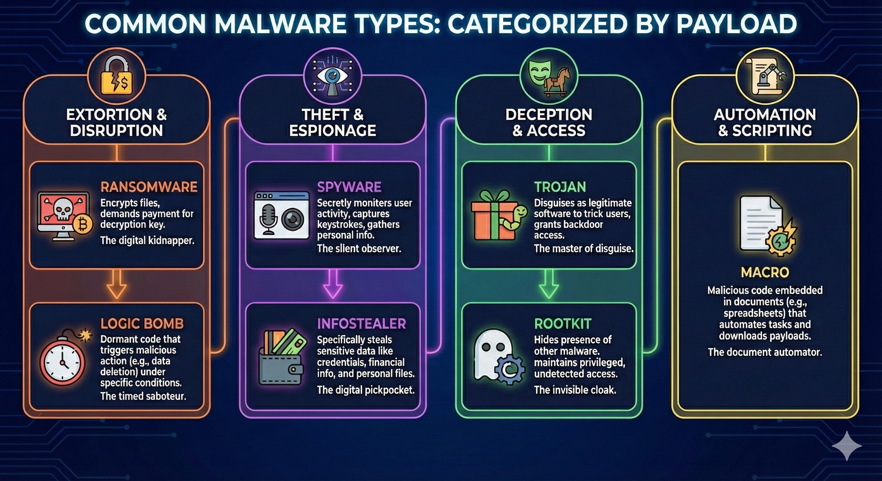 Malware is categorized not by how it arrives, but by its payload (its objective).