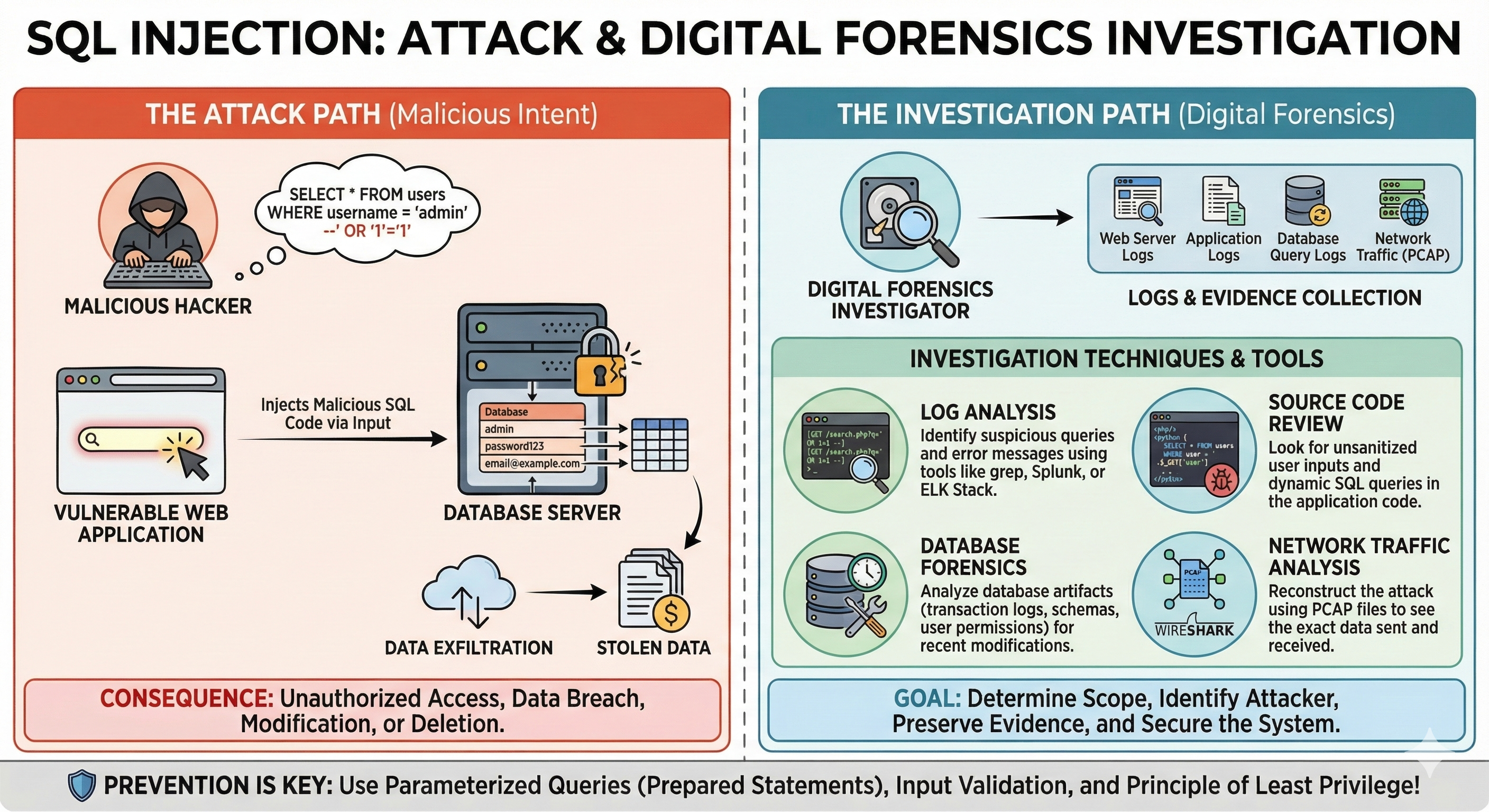 - Concept: The attacker inputs malicious SQL database commands into a web form (like a login box) to trick the database into revealing information.