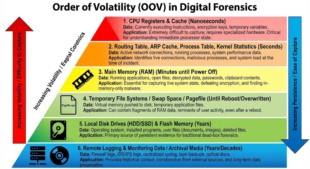 - Order of Volatility: The sequence of capturing evidence from most fleeting to most permanent.