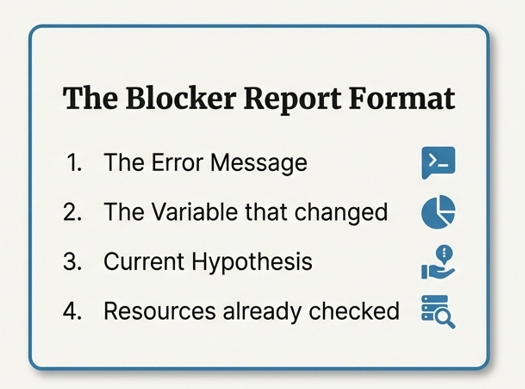 - The Blocker Report: If you cannot solve it, you escalate. But you must escalate correctly. Do not say, "It's broken." Provide the error, the variable that changed, your hypothesis, and the resources you already checked. This shows respect for your manager’s time.