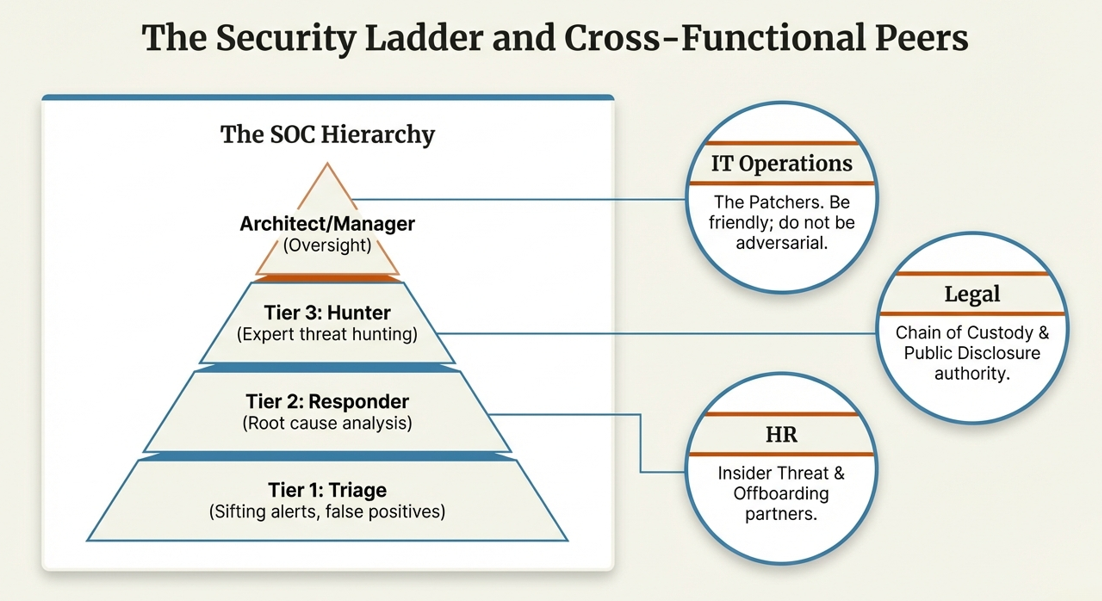 - IT Operations/Helpdesk: You might detect a vulnerability, but IT Ops are the ones who have to patch it. Building a friendly relationship with them is essential; if you are adversarial, your tickets will be ignored.