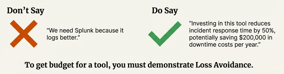 - Translation: Instead of saying, "We need Splunk because it logs better," you say, "Investing in this tool reduces our incident response time by 50%, potentially saving us $200,000 in downtime costs per year."
