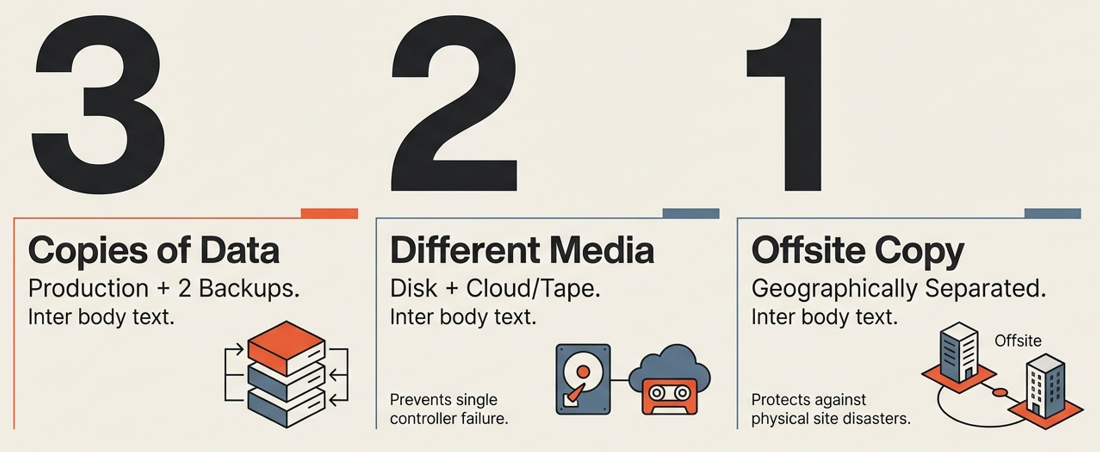 If the architecture is the car, data is the passenger. We must ensure the passenger survives the crash. The industry standard for backup reliability is the 3-2-1 Rule.