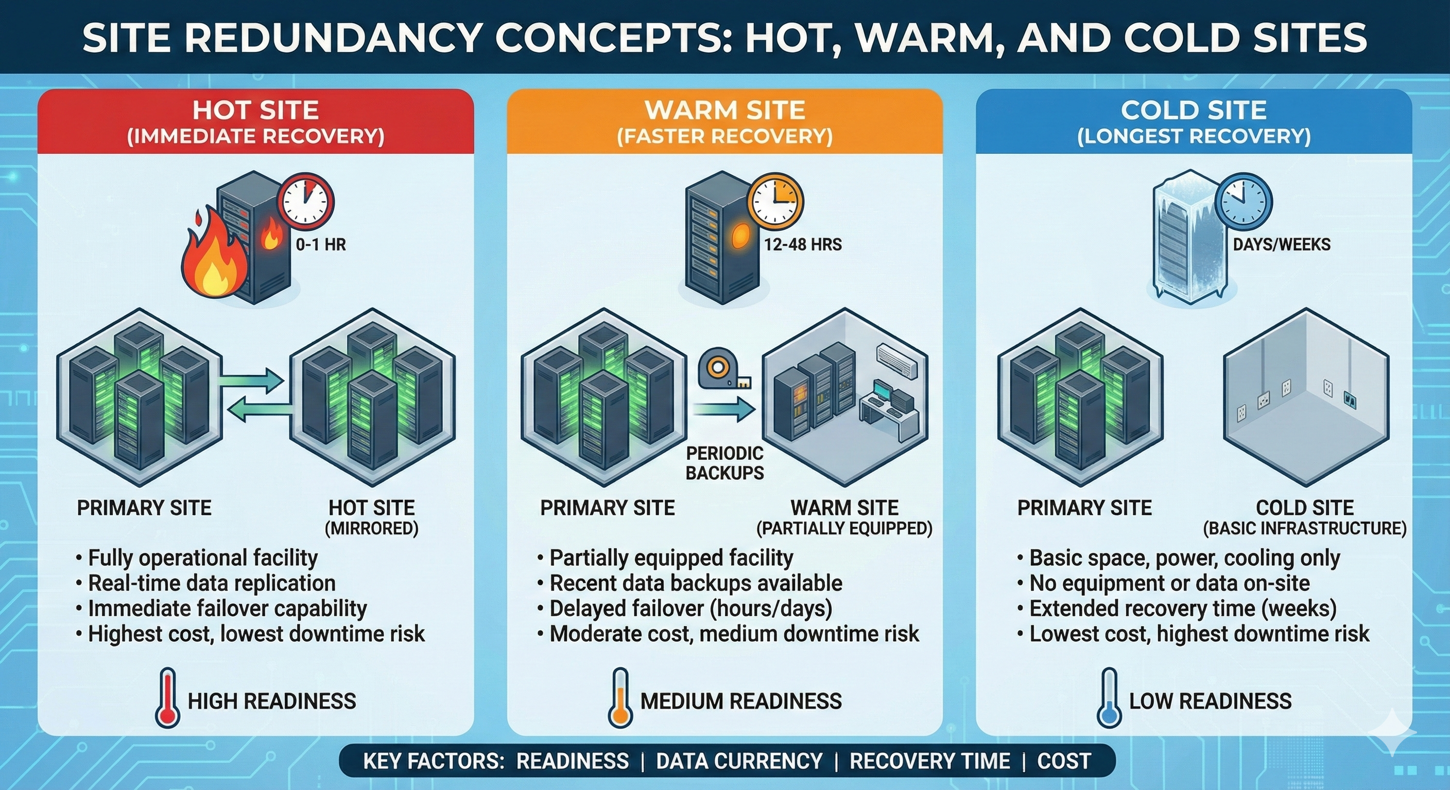 Before choosing a recovery site, an organization must balance the cost of downtime against the cost of infrastructure. Site Redundancy is the practice of maintaining secondary locations that can take over operations if the primary site fails. These are generally categorized by their "readiness" level.
