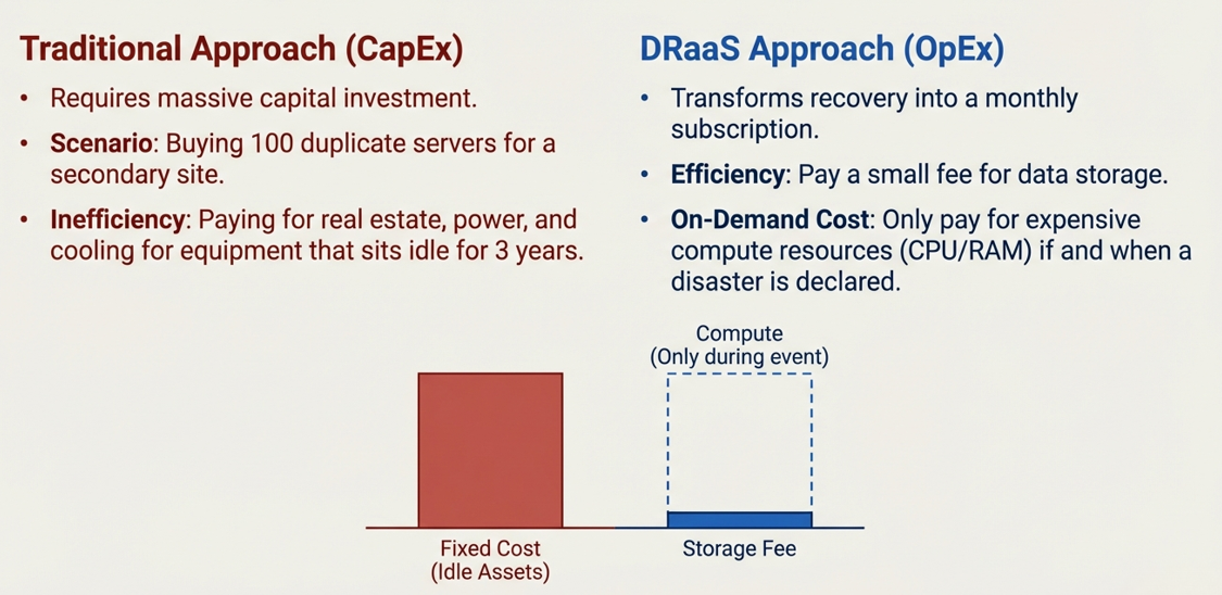 DRaaS transforms disaster recovery from a Capital Expense (buying hardware) to an Operating Expense (paying a monthly subscription).