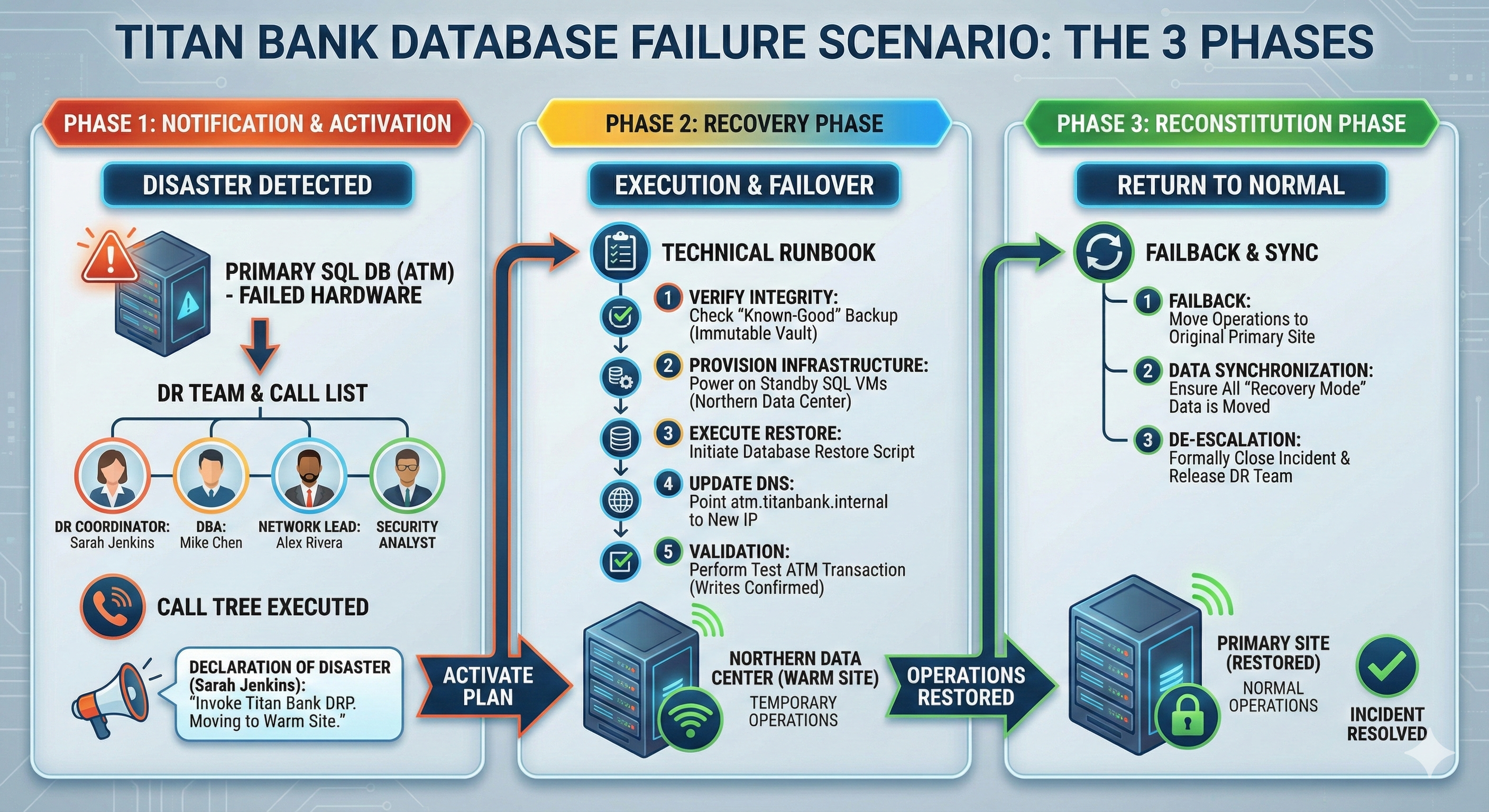Declaration of Disaster: "As of 08:45 AM, following the failure of the primary ATM SQL Cluster and a failed local hardware repair attempt, I, Sarah Jenkins (DR Coordinator), officially invoke the Titan Bank Disaster Recovery Plan. We are moving to failover operations at the 'Warm Site' located in the Northern Data Center."