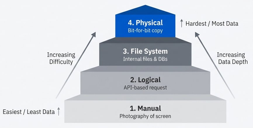 Once the device is legally secured and physically preserved, the examiner must choose an extraction method. While we will cover these deeply in Chapter 6, it is vital to understand the hierarchy of acquisition now. Methods are generally ranked by how much data they recover and how difficult they are to perform.