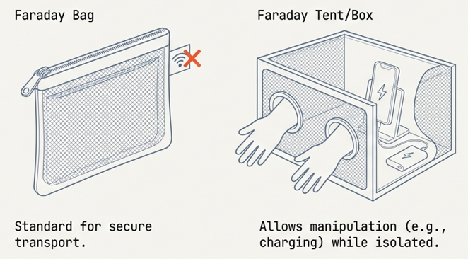 History and Types: While Faraday bags are the primary transport method, the concept extends to larger environments. Historically and currently, Faraday Tents and Faraday Cages (entire shielded rooms) are used in forensic labs. These allow an examiner to take the device out of the transport bag and manipulate it (e.g., to perform an extraction) while still blocking external signals. This is critical because you cannot plug a cable into a phone while it is sealed inside a bag.