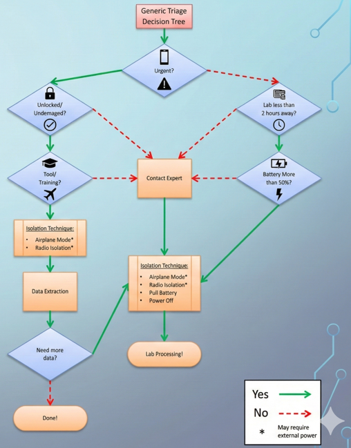 3. The "2-Hour" Rule Can the mobile device be transported to a forensics laboratory in less than 2 hours? If the lab is close, transport is generally safer than attempting a field extraction. If the lab is distant, the risk of battery failure during transport increases, potentially justifying on-site processing.