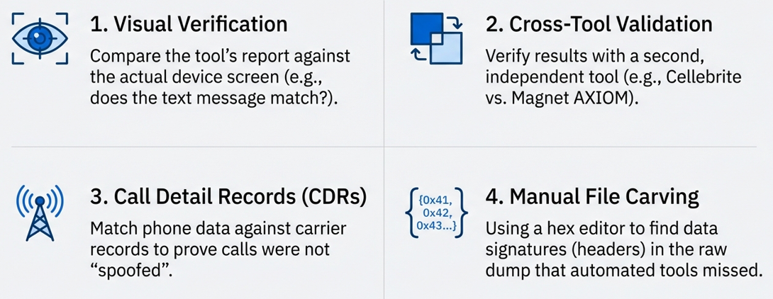 Simply pressing a button in a forensic tool and printing a report is not forensics; it is data processing. Forensics requires Validation. Tools can have bugs. Cables can be faulty. Human error occurs. You must verify that the evidence you present is accurate.
