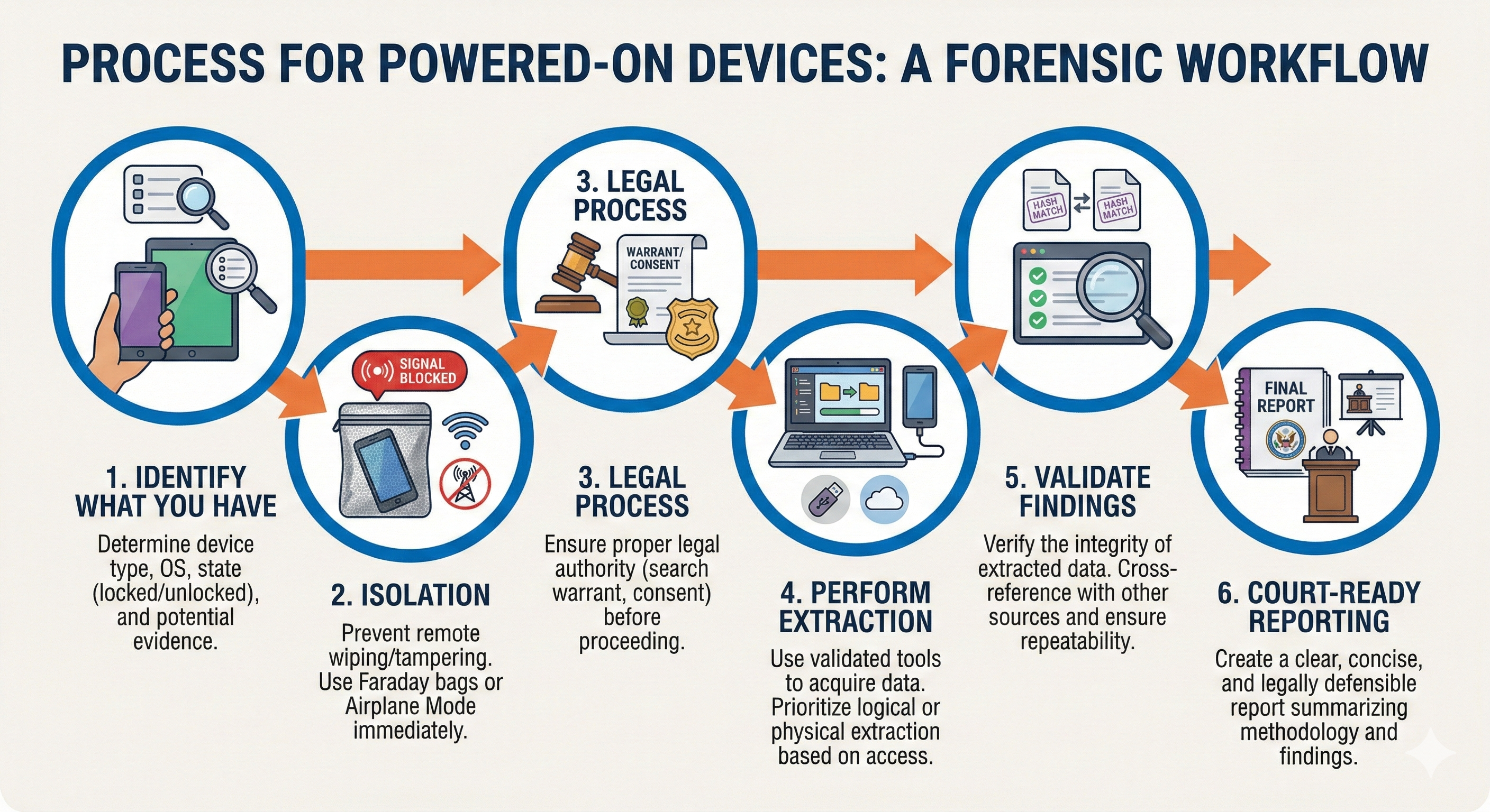 When you encounter a mobile device that is powered on, you are in a race against time (battery life) and security mechanisms (auto-lock and remote wipe). The following six-step process provides a standardized workflow to secure this volatile evidence.