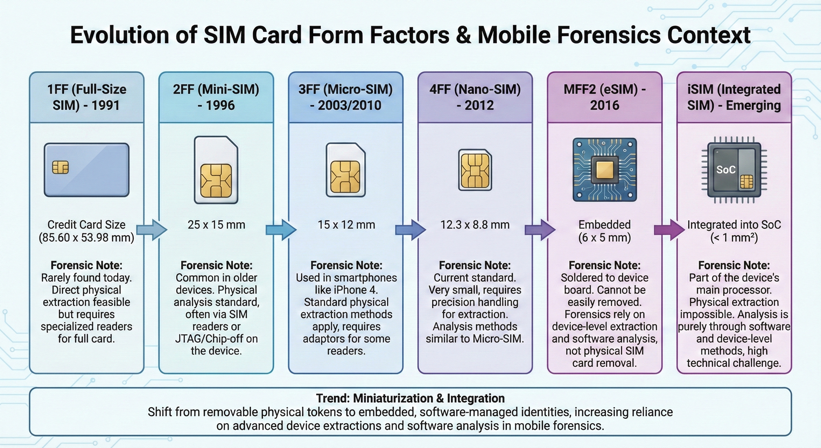 EF_ICCID(serial),EF_IMSI(subscriber ID), andEF_LOCI(location). While modern smartphones store less user data on the SIM, the SIM remains the primary key for network attribution. - Security: SIM cards are protected by PIN and PUK codes. Mismanaging these codes can permanently destroy evidence. Always maintain device isolation (Faraday bags) to prevent network updates from altering volatile SIM data like location artifacts.